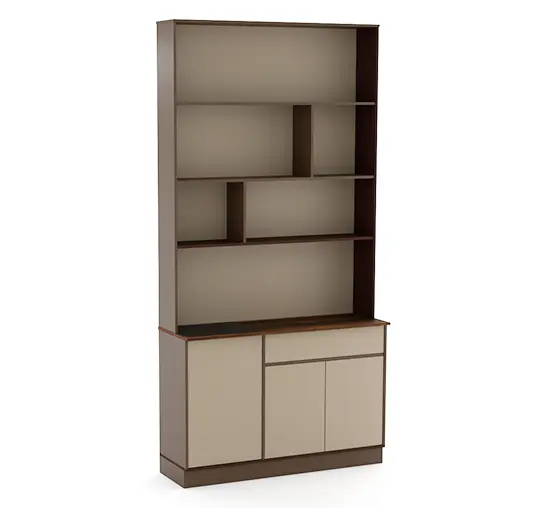 The design harmoniously combines a refined coffee corner and a functional meeting table, creating a welcoming and efficient workspace. The built-in floor bookcase adds warmth and character, showcasing books and decorative elements that enhance the room’s sophistication. Together, these elements form a balanced environment where comfort meets productivity — perfect for informal talks, creative sessions, or professional meetings.