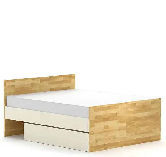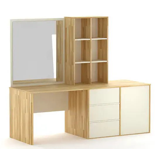 This bedroom features a stylish vanity desk with open shelving and a wide mirror, perfect for organization and daily routines. At the center, a cozy bed with warm-toned bedding and a simple wooden frame anchors the space, creating a relaxing focal point. Beside it, a sleek nightstand with two drawers and a rounded lamp adds both practicality and a touch of elegance to the room’s modern design.